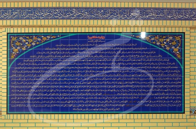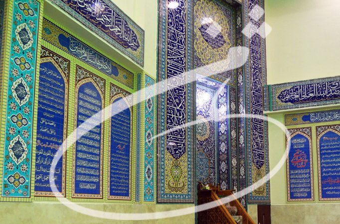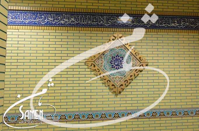 جنس کاشی / کاشی طرح نقوش سنتی به همراه اسماء / حاشیه قاب لوزی روی چوب معرق به